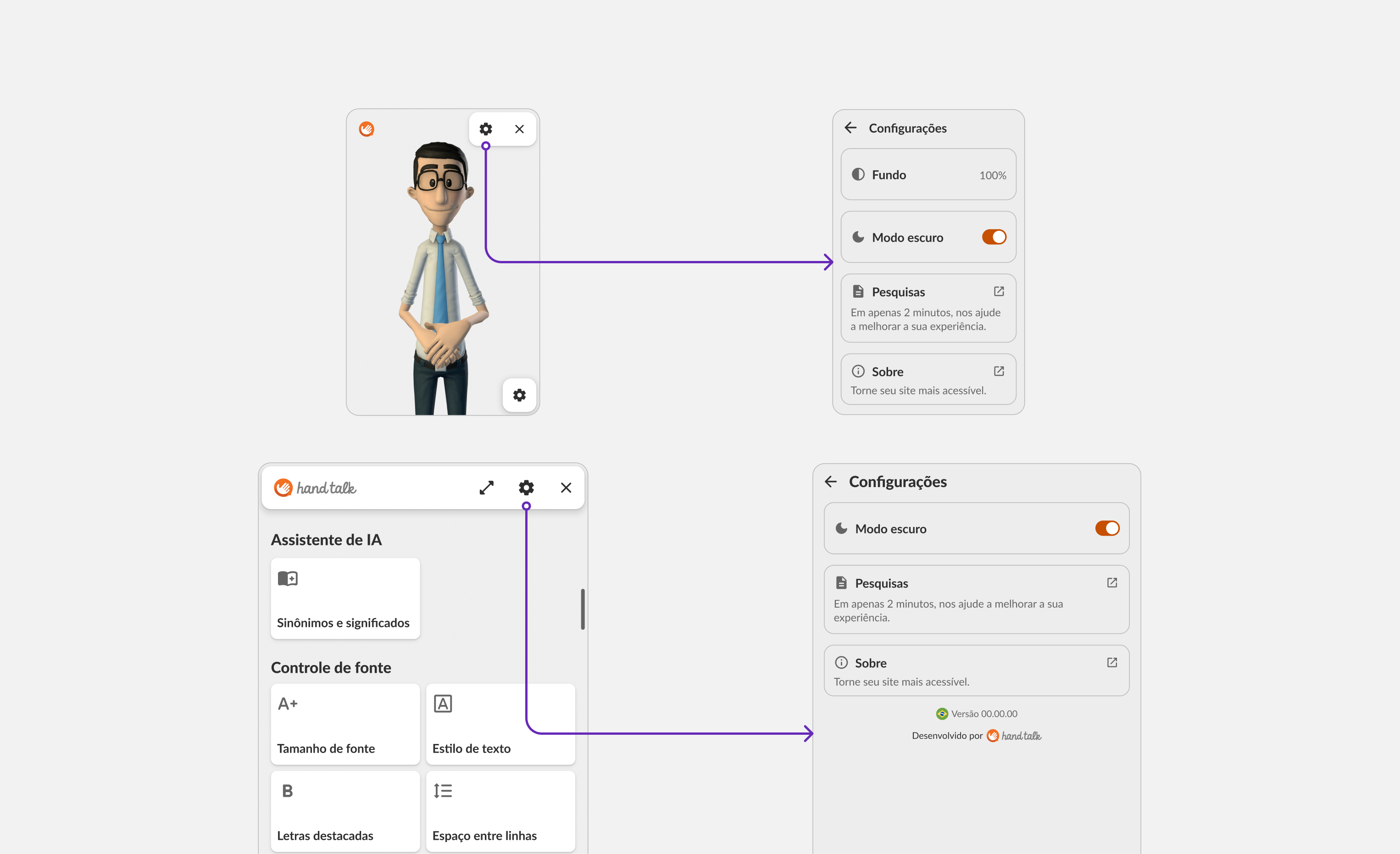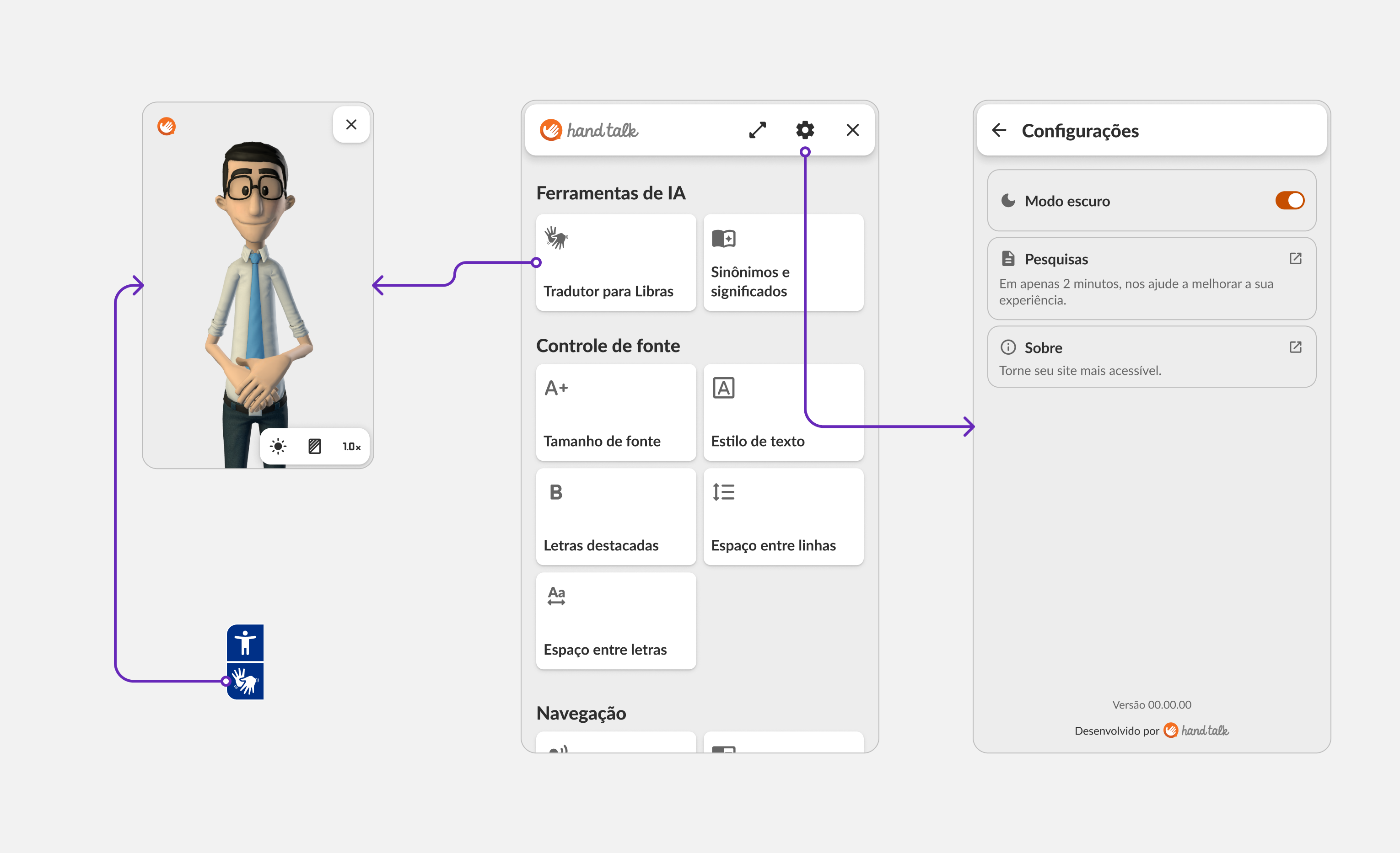 O Hand Talk Plugin é uma solução que oferece ferramentas de acessibilidade para websites. É um produto B2B2C, adotado por empresas que o integram aos seus sites, permitindo que usuários acessem essas ferramentas por meio de uma janela flutuante.
